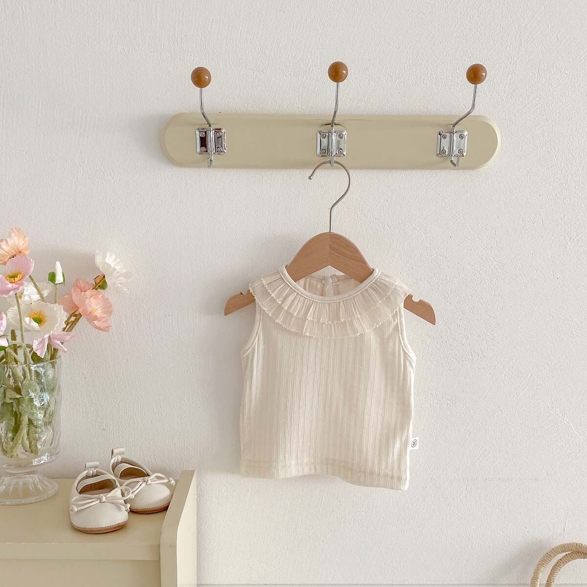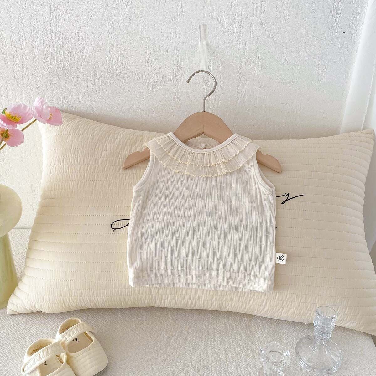 かわいらしいベビーフリル襟がアクセントの、韓国風ノースリーブトップス!夏の暑い日でも快適に着用できるデザインで、さっぱりとした印象を与えつつ、おしゃれを楽しめます。軽やかな素材感で、一日中快適な着心地が魅力のアイテムです!